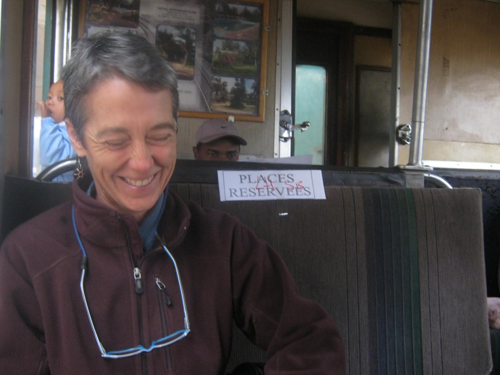 Our reserved seats were in a car with eight sets of narrow benches on each side and a W.C. halfway back. In the second-class car, conditions were much rougher and more crowded. Even within our car, there was an invisible line. The seats on the left-hand side of the train—the more scenic side—were more expensive and were filled with white tourists, all French-speaking except for us. Across the aisle were a mix of tourists and Malagasy people. A toddler stood patting an NBA basketball while his mother hung up bags of baguettes on a hook by the window.